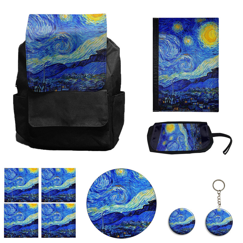 کوله پشتی مدل شب پر ستاره کد M1 همراه کلاسور و جامدادی و زیر لیوانی و جاکلیدی مجموعه 10 عددی