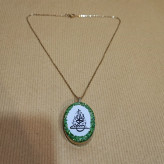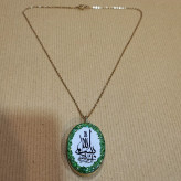 حلقه گردنبند از جنس برنج بوده و داخل آن نام مقدس به صورت 2 طرف متفاوت قرار گرفته و با روکش رزینی پوشیده شده است، این محصول دارای زنجیر استیل طلایی رنگ ثابت به طول 45 سانتیمتر می باشد.