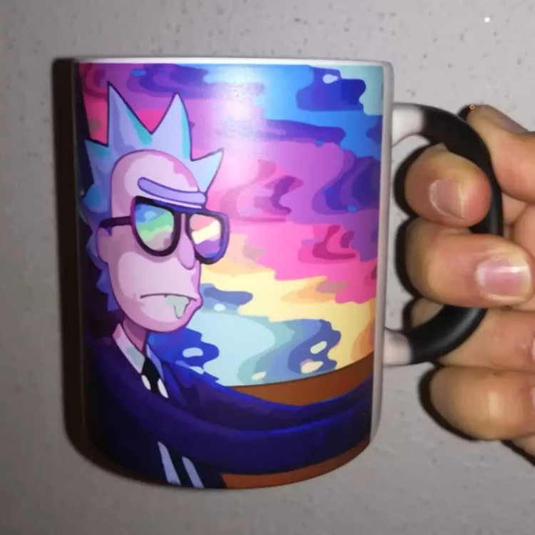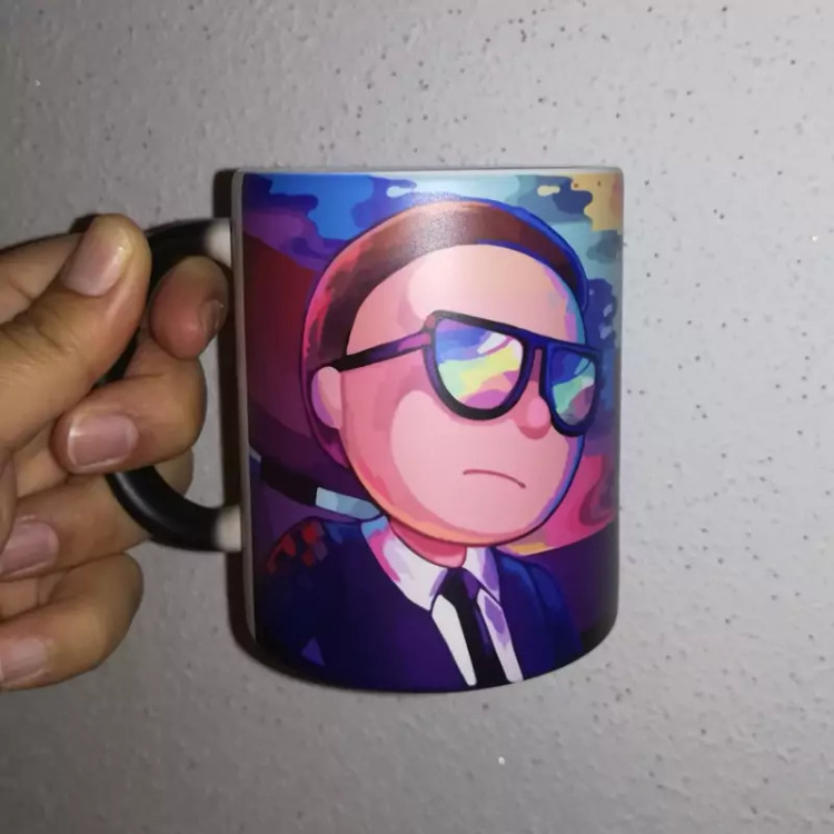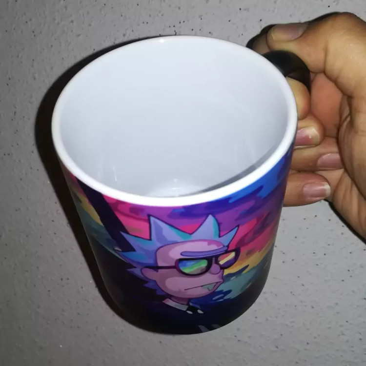 طرح انیمیشن ریک مورتی چاپ شده روی ماگ حرارتی سایز 11oz ،داخل لیوان سفید می باشد